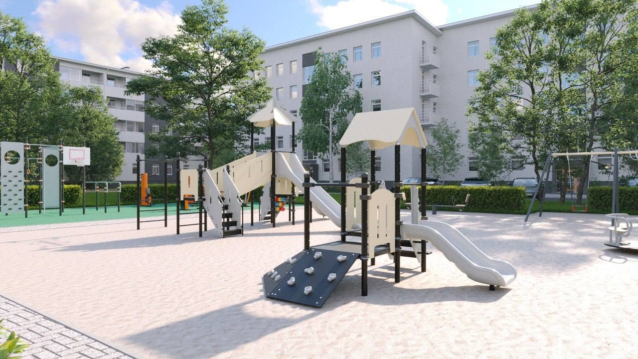 - На Калинина, 148 разместят футбольную площадку, теннисный стол, уличные тренажеры, а для детей — карусель, игровой комплекс и качалки различных типов.