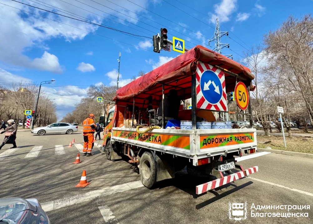 В Благовещенске стартовали сезонные работы по восстановлению дорожной разметки. К реализации проекта привлечены коммунальные службы, подрядные организации и дорожные предприятия.