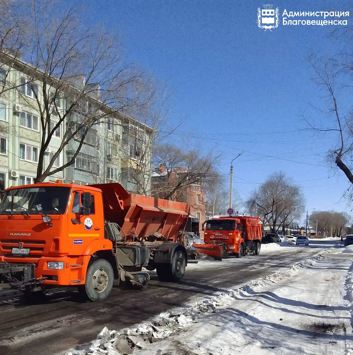 Круглосуточная уборка снега продолжается в Благовещенске после интенсивных осадков в конце февраля.